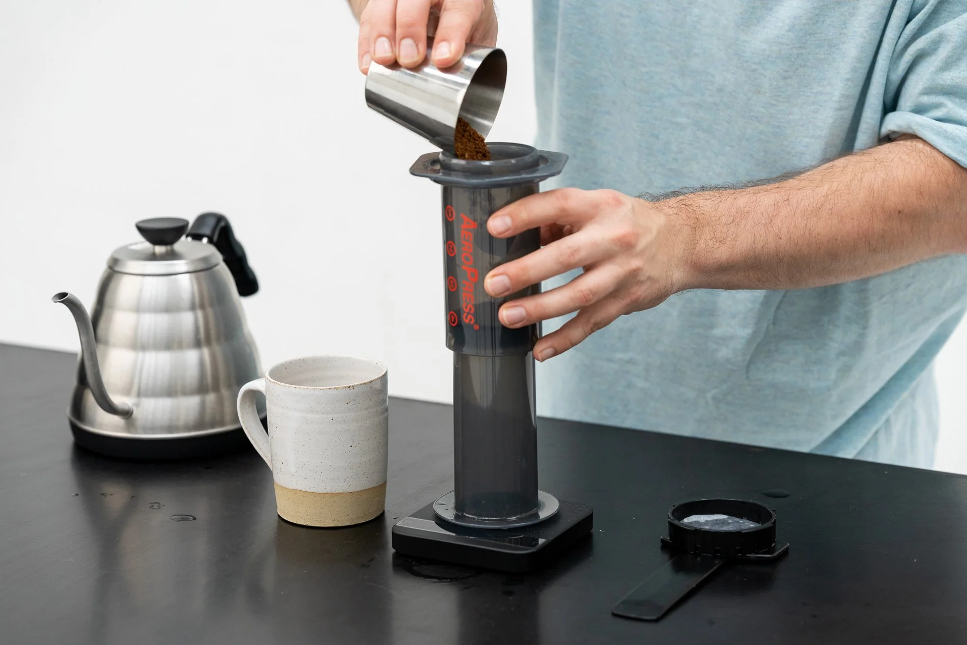 Like everything else we do the aim is consistency. We test the same amount of coffee (an 18g sample) ground on the same grinder at exactly the same grind size. We half fill the aeropress and brew for 2 minutes and top up to the top and leave another 60- 90 seconds.